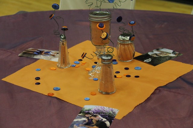Purple, blue and orange, those are the colors I had to work with. Emma’s new mother in law made round table cloths in those colors, then we used a sheer fabric over the top in one of the other colors, topped that with a satin square to anchor the “flower arrangements”.