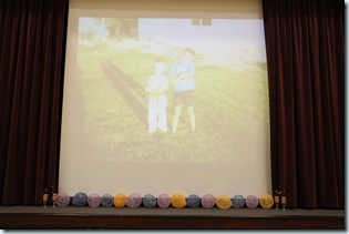 Now, I had no real idea of what these should be, or be called, I just wanted a way to spread some color around the room and add a festive touch. But when we started to put these together my daughter in law Shay said they looked like Dr Seuss’ Truffula trees! Well when you combine those with our fanciful table centerpieces I had an ah-ha moment and realized we had a theme! We also used some of the “balloons” to border the video screen where we were showing dozens of pictures of the bride and groom through their lives.![]()